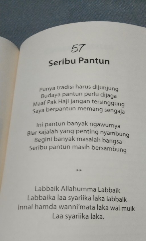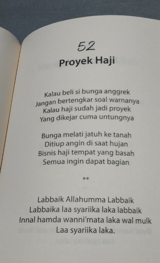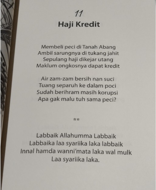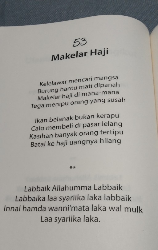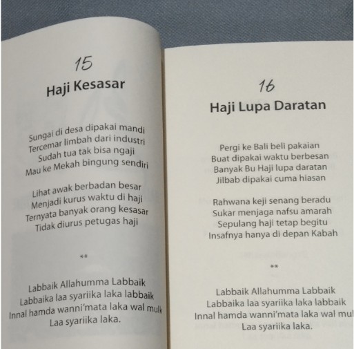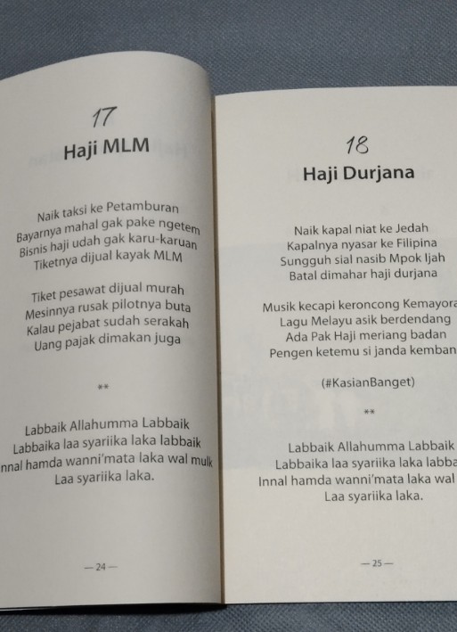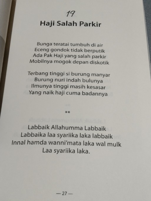 Pantun-pantun dengan tema seputar haji mungkin juga sudah sering dituturkan, misalnya oleh para mubaligh yang berceramah di forum walimatus safar. Penuturan mereka pasti lebih baik karena mereka memang tahu seluk beluk haji dan maknanya. Sedangkan saya, naik haji saja belum pernah, kecuali dalam mimpi. Tapi perasaan jengkel terhadap penyelenggaraan ibadah haji adalah hak semua orang, termasuk mereka yang belum naik haji. Kejengkelan itu juga yang mendorong saya untuk merefleksikannya dalam bait-bait pantun.