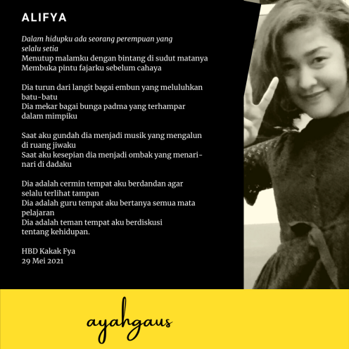 Sebagai ayah teladan dan idaman, saya menulis puisi dan membacakannya di depan teman-teman Alif, dan sempat divideokan oleh anak saya yang kedua, Raysa Falsafa Nahla. Di twiter saya video itu saya posting dan menanyakan siapa ayah yang menulis puisi untuk anak gadisnya yang berulang tahun dan membacakannya, kalau tidak ada berarti saya ayah yang langka, heheee..