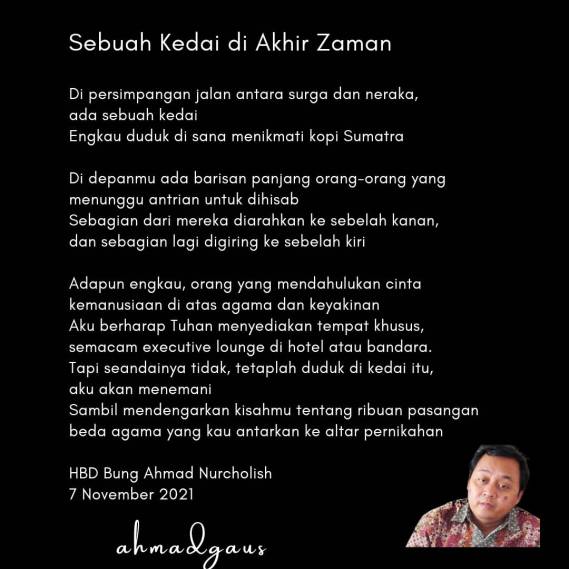 Teman saya, Ahmad Nurcholish, adalah salah satu orang hebat yang saya maksud. Dengan bekal pengetahuan agama dari pesantren, pemahaman terhadap kitab-kitab klasik, dan pengalaman interaksi lintas agama dan keyakinan, dia mewakafkan seluruh hidupnya untuk membantu orang-orang yang merasa kesulitan untuk melangsungkan pernikahan beda agama. Sampai saat ini sudah ribuan orang yang dia bantu mewujudkan impian mereka untuk hidup dalam ikatan pernikahan, walaupun beda agama.