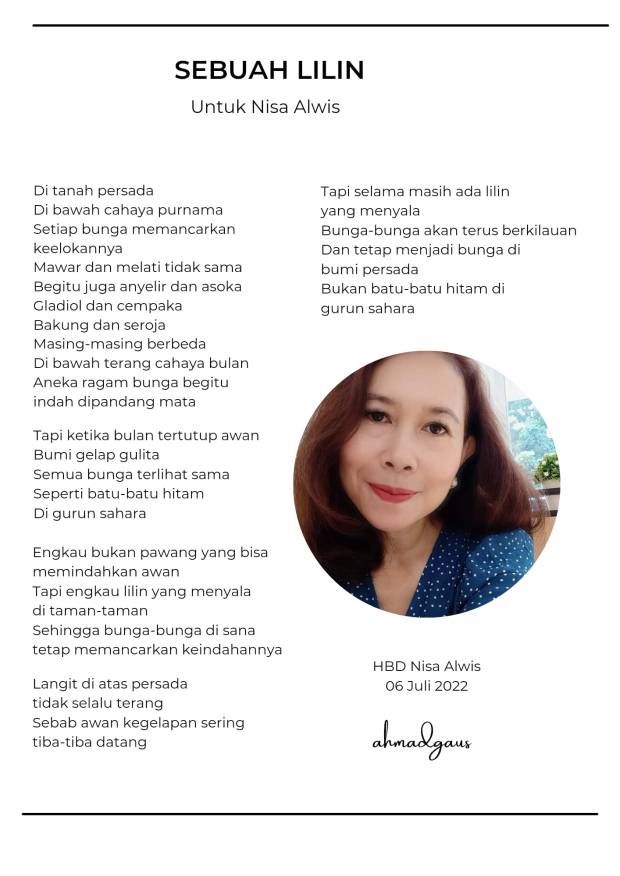 Nisa Alwis adalah lilin di tengah kegelapan. Kok bisa? Ya ikuti saja facebook nya, insya Allah banyak pencerahan dari alumni Pesantren Darun Najah dan Monash University, Australia ini.