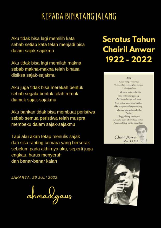 RASANYA MUSTAHIL membicarakan jatidiri puisi Indonesia tanpa menyebut nama Chairil Anwar. Sama mustahilnya dengan membicarakan jatidiri bangsa Indonesia tanpa menyebut Bung Karno. Bukan kebetulan bahwa keduanya hidup di zaman yang sama, zaman revolusi, dan sama-sama menjadi patriot bagi revolusi itu sendiri, walaupun di antara keduanya ada selisih usia yang cukup jauh — Chairil Anwar lahir pada 1922 dan Bung Karno lahir pada 1901.