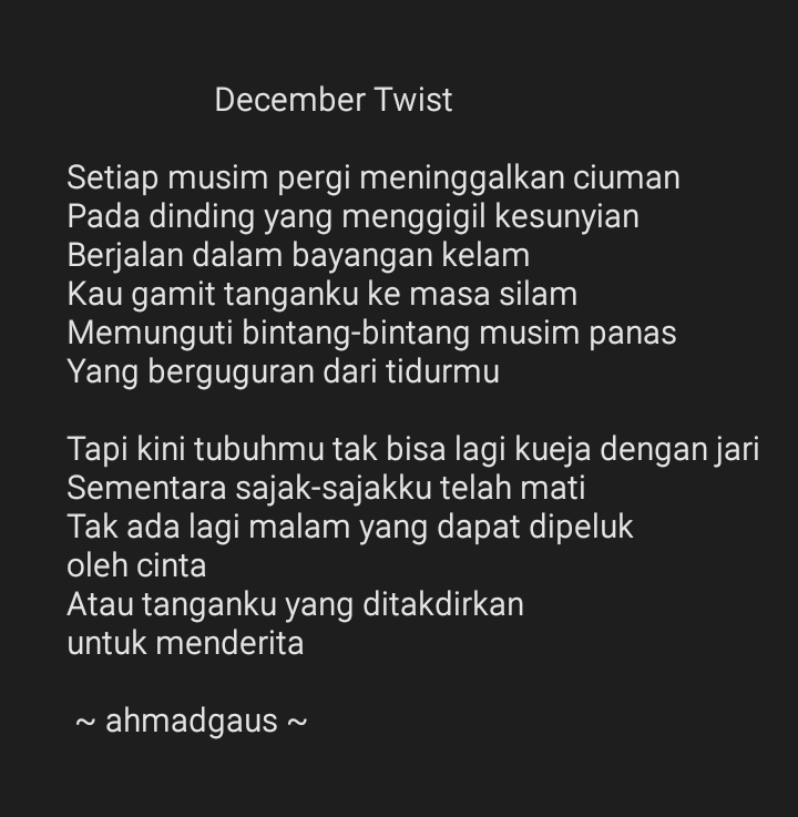Lewat tengah malam listrik padam. Tapi langit begitu terang. Para malaikat beriringan membawa obor yang dibuat oleh nenekku. Menyebrangi sungai yang masih jernih dan luas di kampungku.